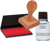 sello personalizado base madera, frasco de tinta 50 grs. y tampón
